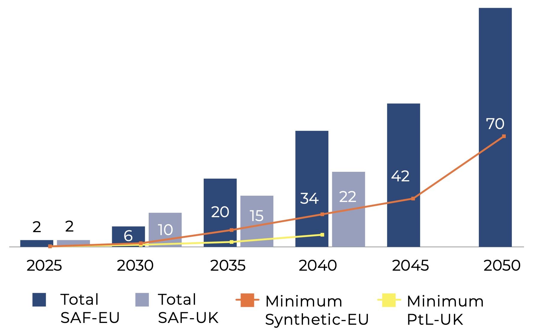 SAF blending targets in the UK SAF mandate compared to ReFuelEU Aviation mandate