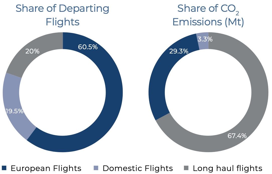 In 2023, approximately 940,000 flights departed from UK airports, registering 32.0 Mt of CO2 emissions. In comparison with 2022, this represented a total flight growth of 15.8% and CO2 emissions growth of 22.8%. The business is gradually recovering to reach the pre-pandemic peak – by the end of 2023 air traffic was at 87.6% of the 2019 level of total flights and 89.8% of CO2 emissions (UK Transport & Environment, 2024). EasyJet, British Airways and Ryanair are the three major players in the market and together account for well over half of UK departing flights and about 60.0% of carbon emissions (UK Transport & Environment, 2024). It is likely that 2024 will have higher emissions than 2023 based on current emission growth trends (UK Transport & Environment, 2024).